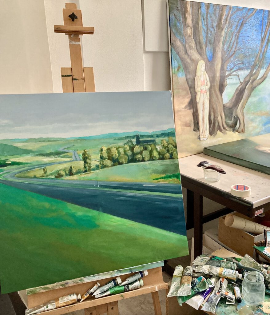Neue Malerei des Ateliers Poessnecker. Werke von Ruth Sedo und Ulrich Poessnecker. Es sind bunte Langohren in Farbräumen, ein Schmetterling, Blattwerk und nachdenkliche junge Damen vor lebendigen Farbflächen.